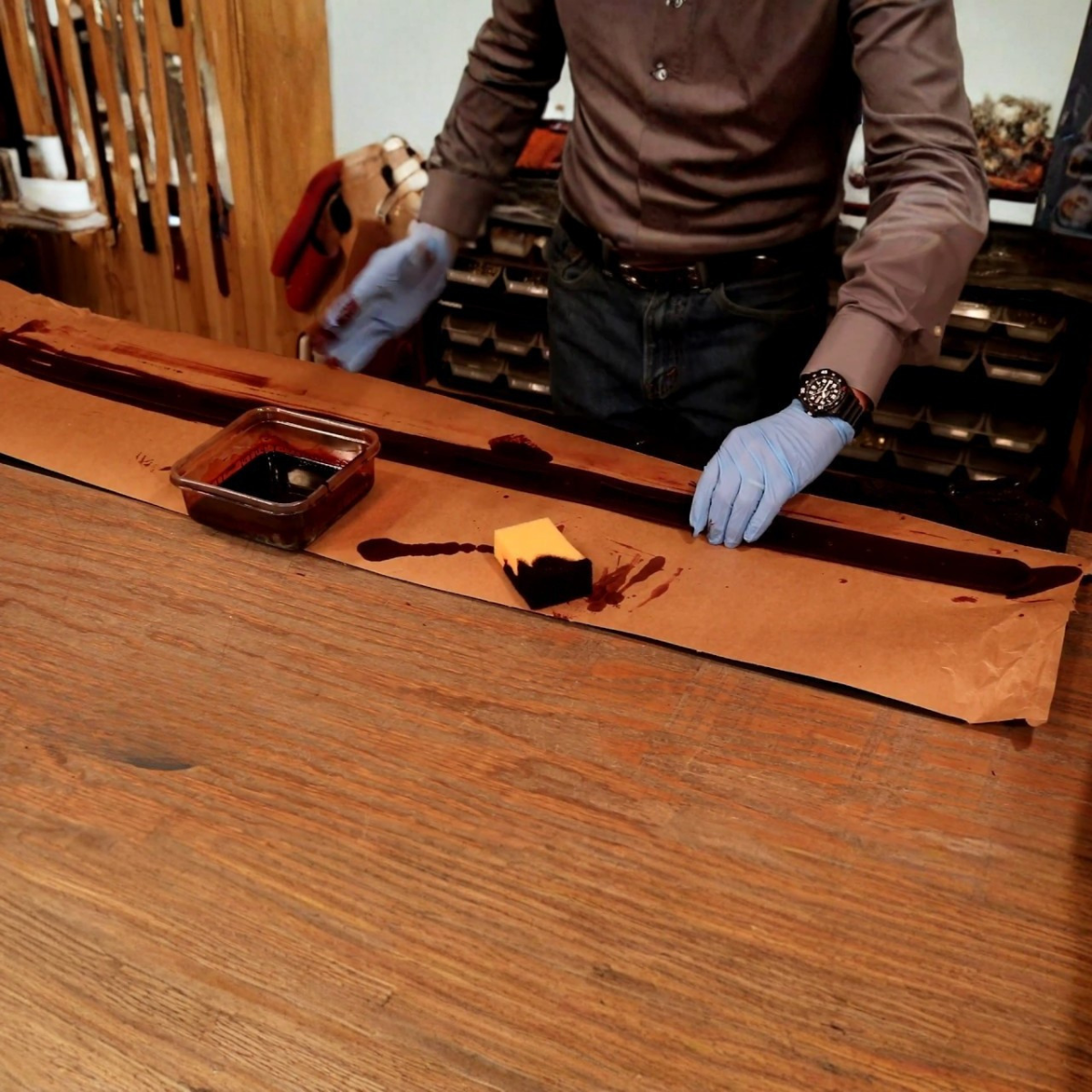 El trabajo se realiza de manera manual, utilizando tintes especializados para cuero, respetando la textura, flexibilidad y carácter del material. El proceso incluye preparación de la superficie, aplicación del tinte en capas y sellado final para lograr un acabado uniforme, natural y resistente al uso diario.